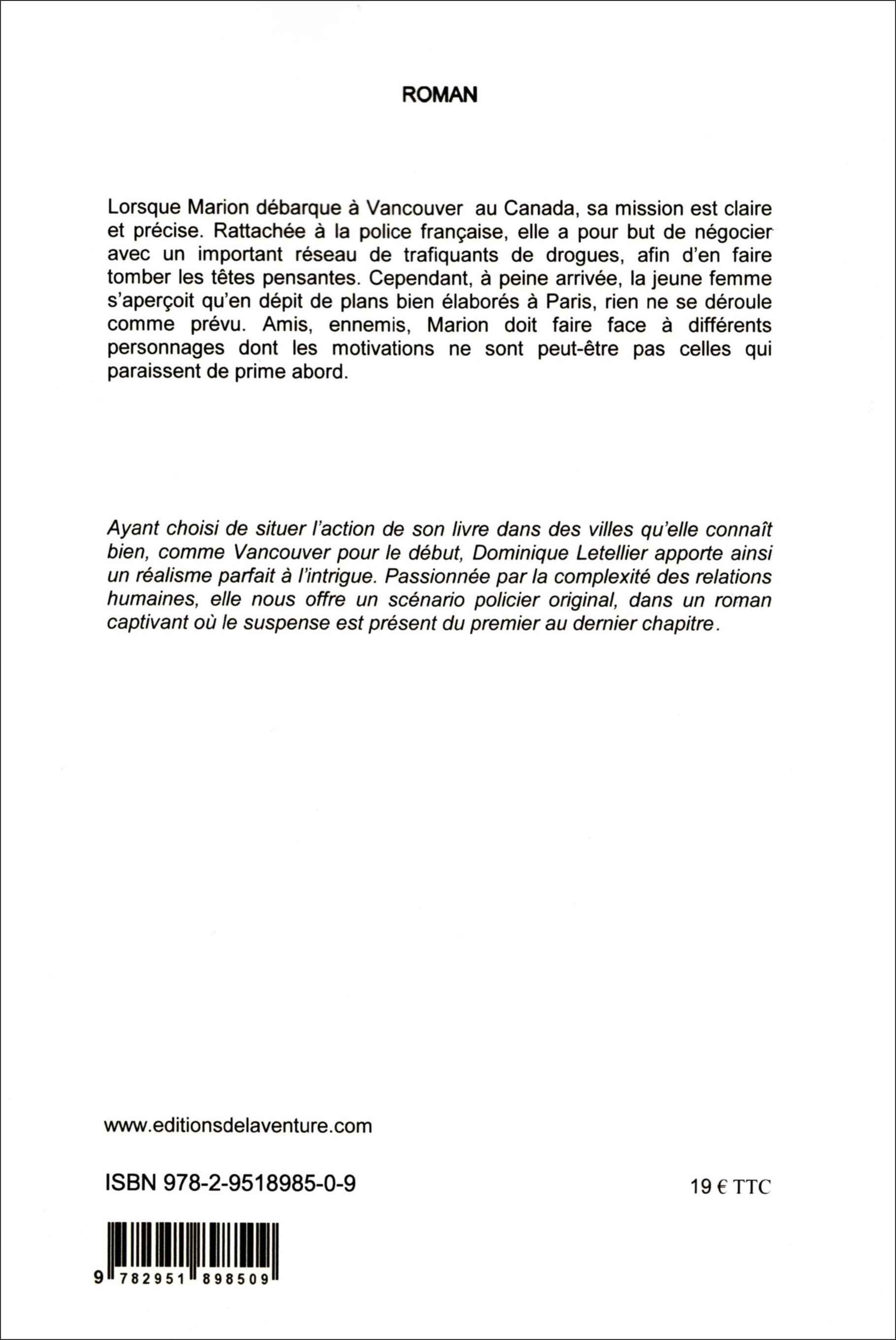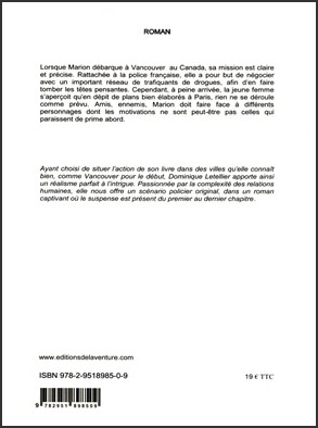Ayant choisi de situer l’action de son livre dans des villes qu’elle connaît bien, comme Vancouver pour le début, Dominique Letellier apporte ainsi un réalisme parfait à l’intrigue. Passionnée par la complexité des relations humaines, elle nous offre un scénario policier original, dans un roman captivant où le suspense est présent du premier au dernier chapitre...